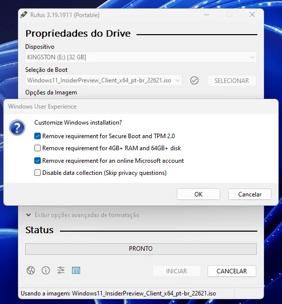 Ontem dia 01/07 foi lançada a nova versão do Rufus 3.19 que permite remover requisitos do Windows 11 e instalá-lo em qualquer máquina que não atenda aos requisitos mínimos incluídos pela Microsoft, além de ignorar a opção de conta online mesmo na versão Pro do Windows 11.