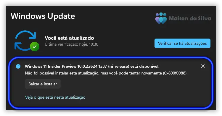 Depois vai até o Windows Update aí pode aparecer que a atualização instalou com falha, neste momento basta repetir e o sistema deve atualizar sem problemas para a nova beta!