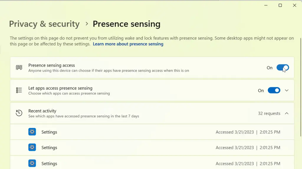 - Estamos apresentando novas configurações de privacidade e APIs do sensor de presença. Se você possui um dispositivo com sensores de presença compatíveis, agora pode gerenciar sua privacidade e bloquear/permitir que determinados aplicativos acessem esses sensores. Nenhuma imagem ou metadados são coletados pela Microsoft e todo o processamento é feito localmente no hardware do dispositivo para maximizar a privacidade. Você encontrará essas configurações em Configurações > Privacidade e segurança > Detecção de presença aqui se o seu dispositivo for compatível. Os desenvolvedores de aplicativos com dispositivos com sensores de presença compatíveis podem direcionar aplicativos para solicitar e ler informações de presença do usuário após solicitar um recurso de presença humana. Saiba mais sobre a API aqui.