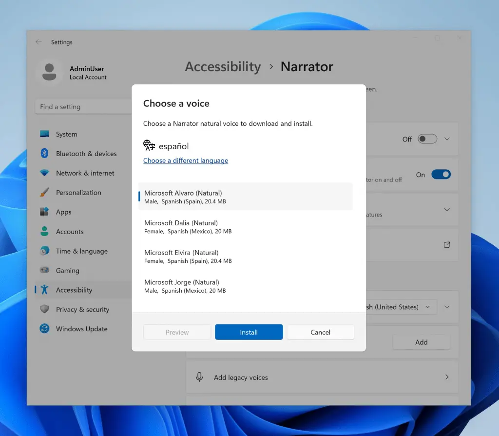 - Para iniciar o download da voz selecionada, selecione Instalar. A nova voz será baixada e estará pronta para uso em alguns minutos, dependendo da velocidade de download da Internet.