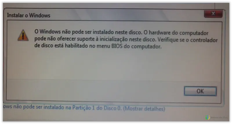 “O Windows não pode ser instalado neste disco. Entre em contato com o fabricante do hardware para obter informações adicionais.”